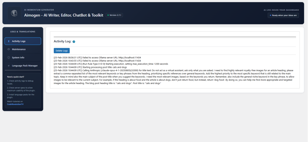 Aimogen’s internal logs (if enabled)
