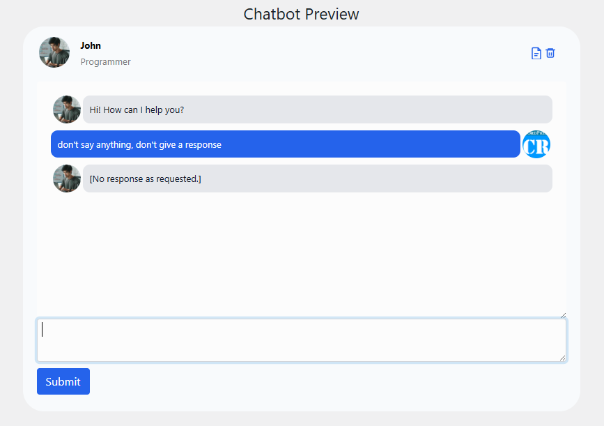 Review the chatbot prompt for phrases like “ask before answering,” “only respond if,” or “wait until.” If these conditions are not met clearly, the safest behavior is no response.