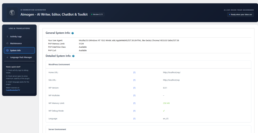 Aimogen’s diagnostics system exists to make a complex AI-powered plugin predictable and debuggable. If something isn’t working, the status screen almost always explains why.