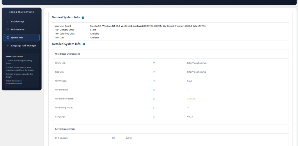 Check details in the plugin’s menu -> ‘Logs & Translations’ menu -> ‘System Info’ tab.