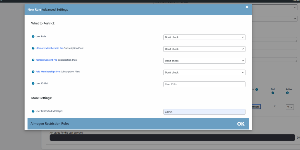 The Ultimate Membership Pro integration in Aimogen connects AI usage control with membership levels and access rules, allowing you to expose AI features selectively based on subscription status. This integration is designed for sites that monetize AI access, gated content creation, or AI-powered tools, without rewriting either plugin’s core logic.